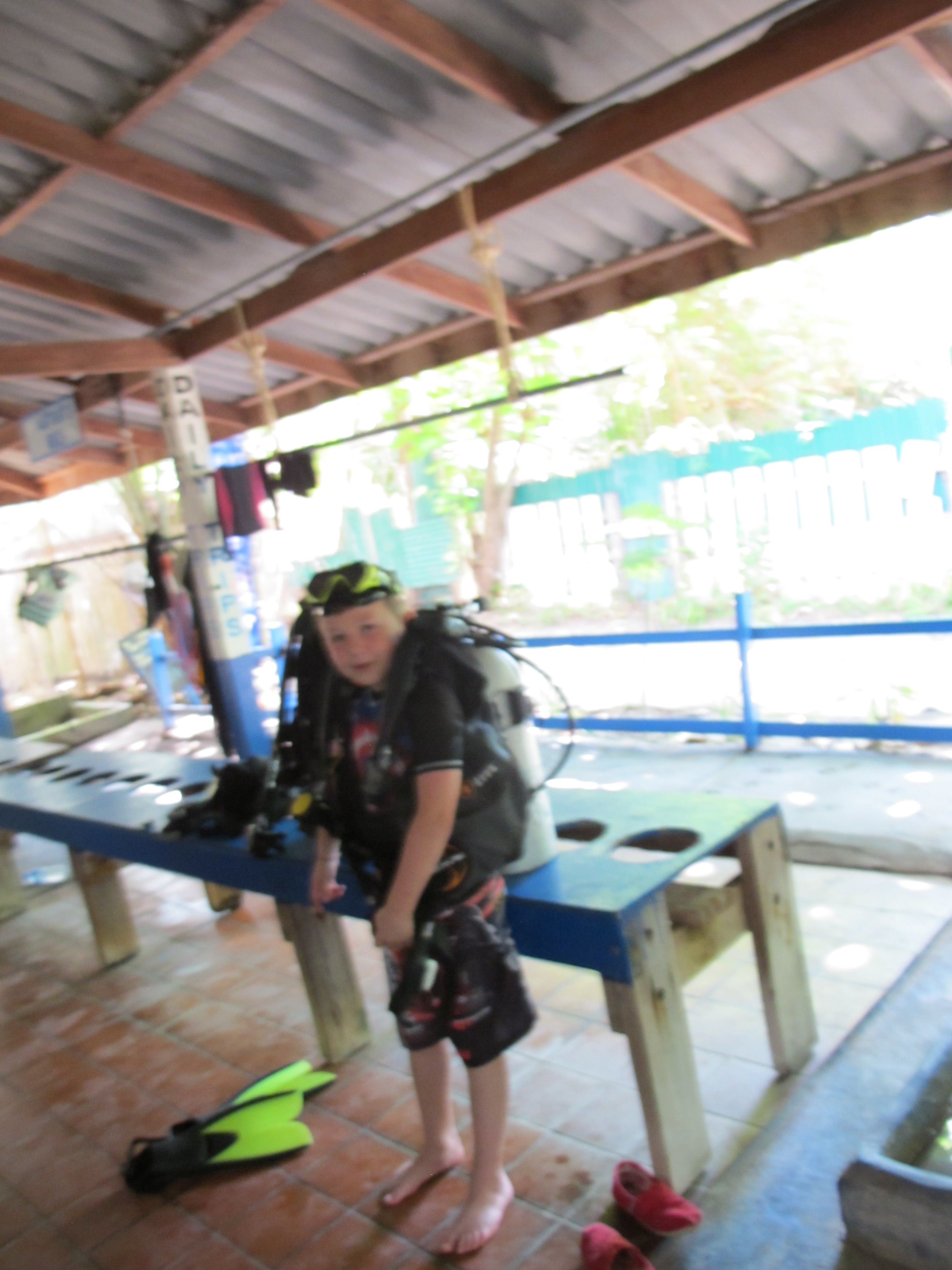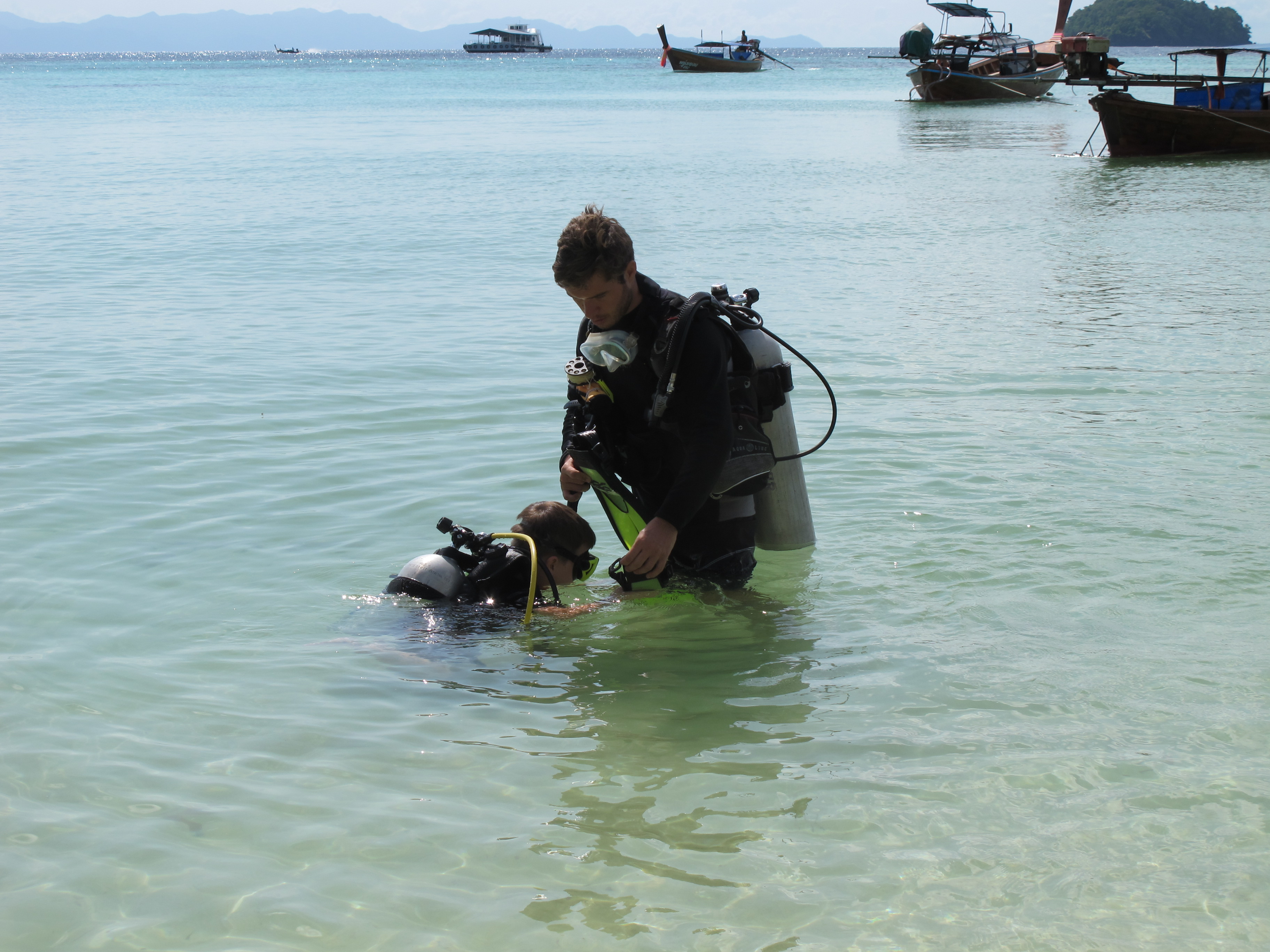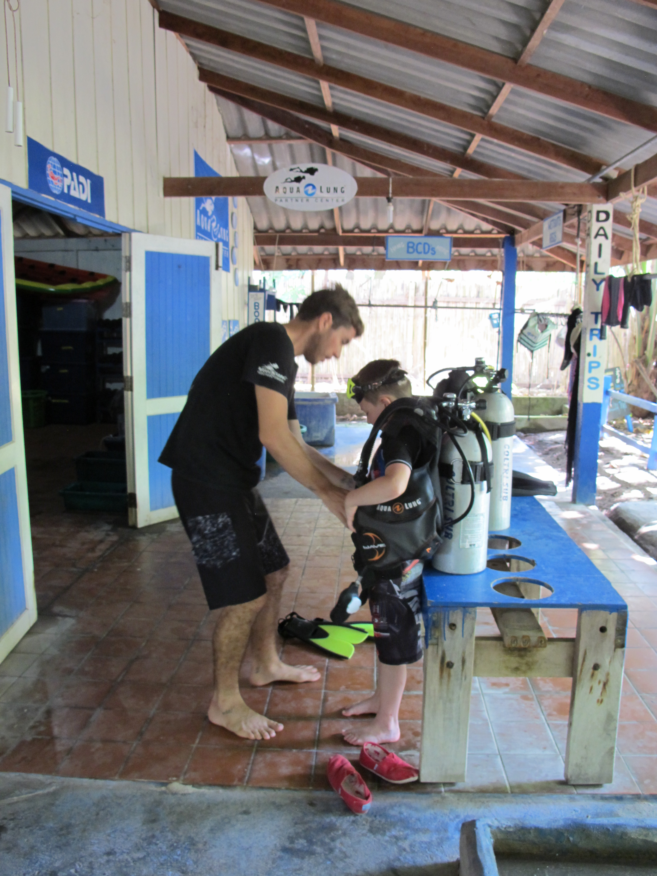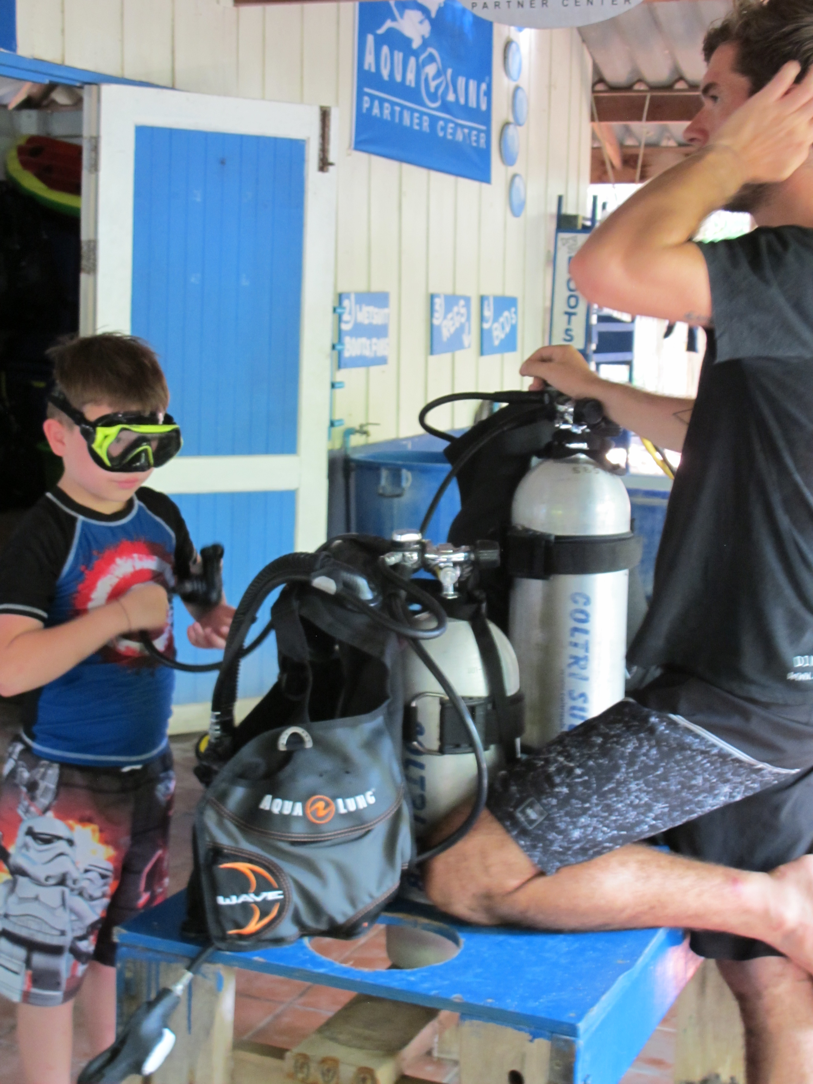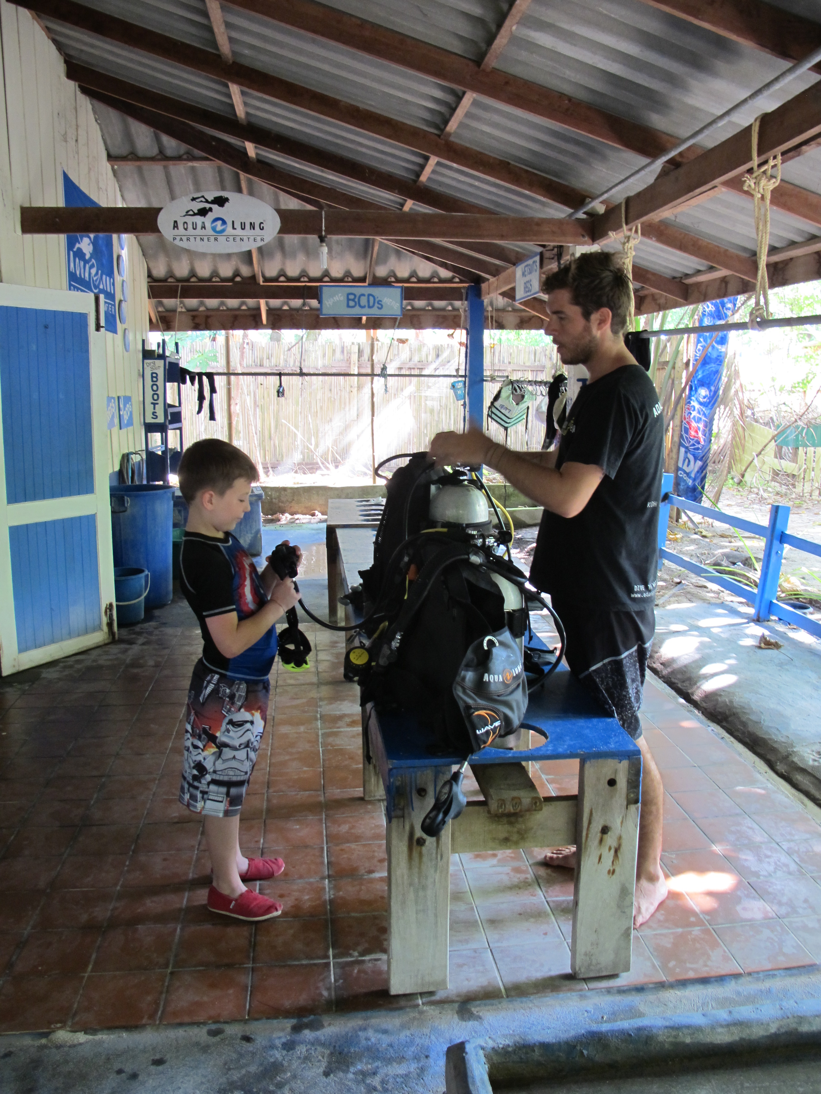 One of the highlights for Alex on this trip, was that he is finally old enough to do a bubblemaker scuba dive adventure. While we prepped Mark to go out diving, Alex learned how to dive too. With a Bubblemaker dive, kids from 8 and up can go diving with an instructor, no deeper than 2 meters. We went to Adang Sea Divers dive shop, www.adangseadivers.com and Kris was the instructor who helped Alex out. Couldn’t have asked for a better person to go with Alex, he had a ton of patience, good sense of humor and really seemed to enjoy his job.